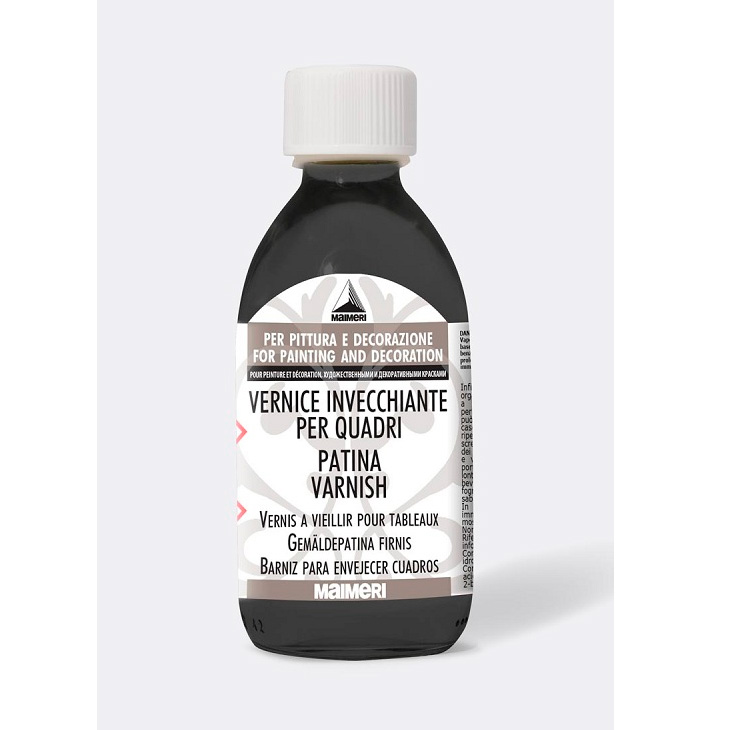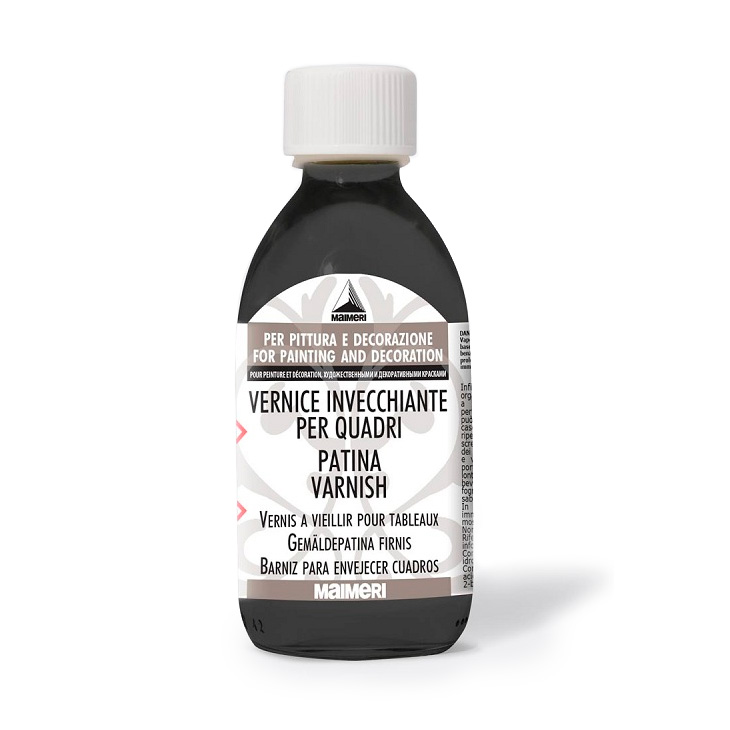 Лак патинирующий живописный Maimeri. Представляет собой прозрачный жирный лак янтарного цвета с фиолетово-бордовым оттенком на основе уайт-спирита.
