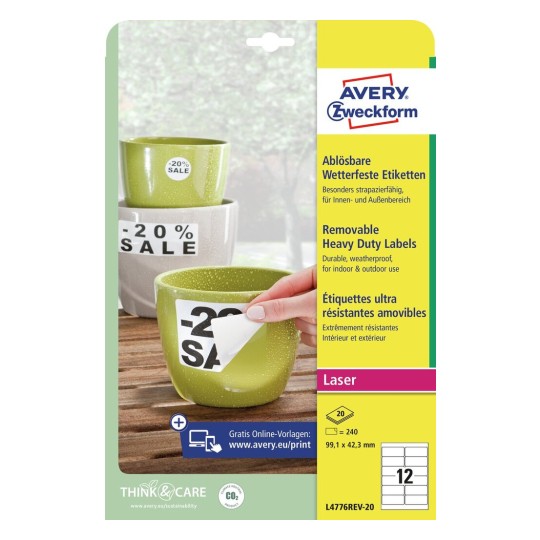 Прочные белые водостойкие этикетки из полиэстера, размер 99,1 х 42,3 мм, для печати на лазерных принтерах. Стойкие этикетки удаляются без следов клея на поверхности. Идеально подходят для рекламы на улице и временной маркировки. Они масло- и грязестойкие, термостойкие, выдерживают перепады температур (от -20 °C до +80 °C) и водонепроницаемые. Благодаря бесплатному программному обеспечению и шаблонам Avery Zweckform вам совсем не нужно тратить время на дизайн и печать этикеток и самоклеящейся бумаги А4. Мы предлагаем большой выбор дизайнов и готовых шаблонов для печати. Просто введите номер артикула с упаковки, выберите нужный дизайн, создайте свою этикетку и распечатайте! Готово!