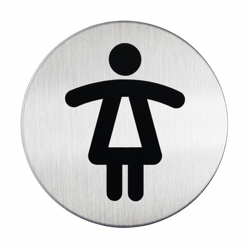 Пиктограмма "WC женский" из матированной стали. Изображение не стирается и не царапается. Крепиться на гладкую поверхность с помощью двусторонней клейкой подушечки. Диаметр 83 мм....