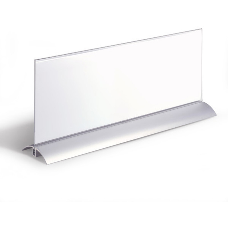 Для проведения конференций и встреч, а также для стойки рецепции. Удобен для маркировки образцов продукции во время проведения выставок, а также может использоваться в качестве ценника при оформлении розничных витрин. L-образной формы, со сменным вкладышем.