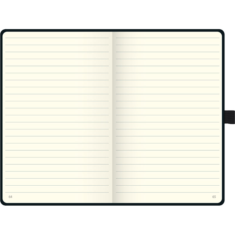 Блокнот на резинке "Компаньон" выполнен из бумвинила, имеет черный обрез, листы: кремовая бумага, крепление для ручки, 2 вклеенных закладки, боковой карман для бумаг на внутренней стороне задней обложки, пронумерованные страницы, клейкие закладки, боковая застежка-резинка.