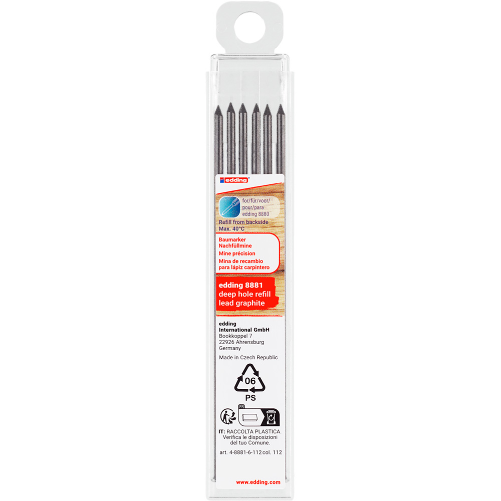 Комплект запасных грифелей edding 8881, подходящих для строительного карандаша для глубоких отверстий edding 8880. Набор из 6 графитовых грифелей. Для нанесения постоянной точной маркировки даже в труднодоступных местах.
