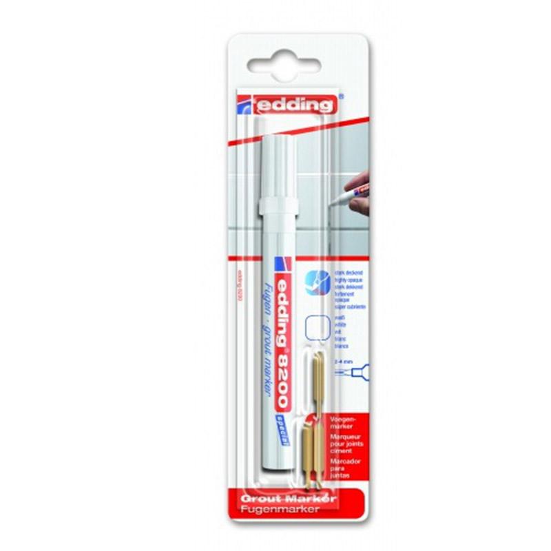 Маркер edding 8200 с водостойкими и неразмазывающимися чернилами доступен в цветах, чаще всего используемых для обработки кафельных швов: в серебряно-сером и белом. Маркер поставляется с 3 сменными наконечниками, что позволяет без труда, точно и аккуратно продолжить восстановительные работы, даже если один из наконечников износится.